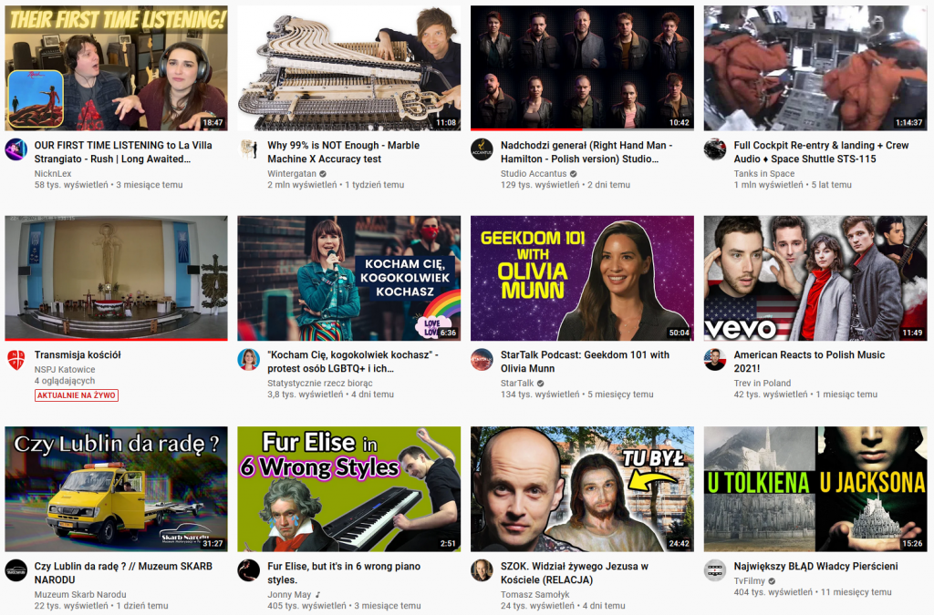 Zerknijmy na zrzuty ekranu mojej strony głównej portalu YouTube z dnia, w którym rozpocząłem pracę nad tym wpisem (sobota, 25 maja 2021, godzina 13:30).