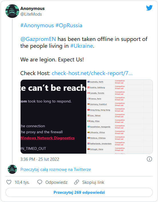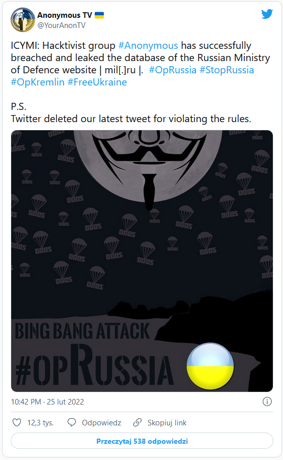 Istotne jest także to, że w przeciwieństwie do oporu ze strony wojska ukraińskiego i państw świata, działań hakerów reżim Putina na pewno nie mógł przewidzieć.