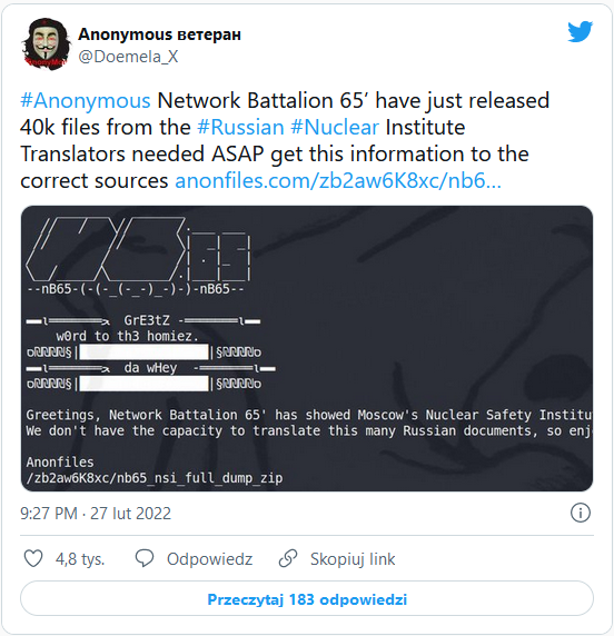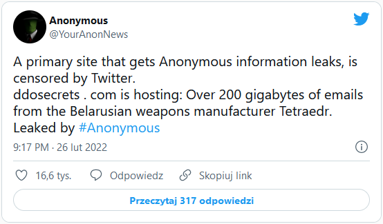 Ponadto grupa wykradła i opublikowała ponad 200 GB danych zawierających korespondencję mailową z białoruskiej fabryki broni Tetraedr.