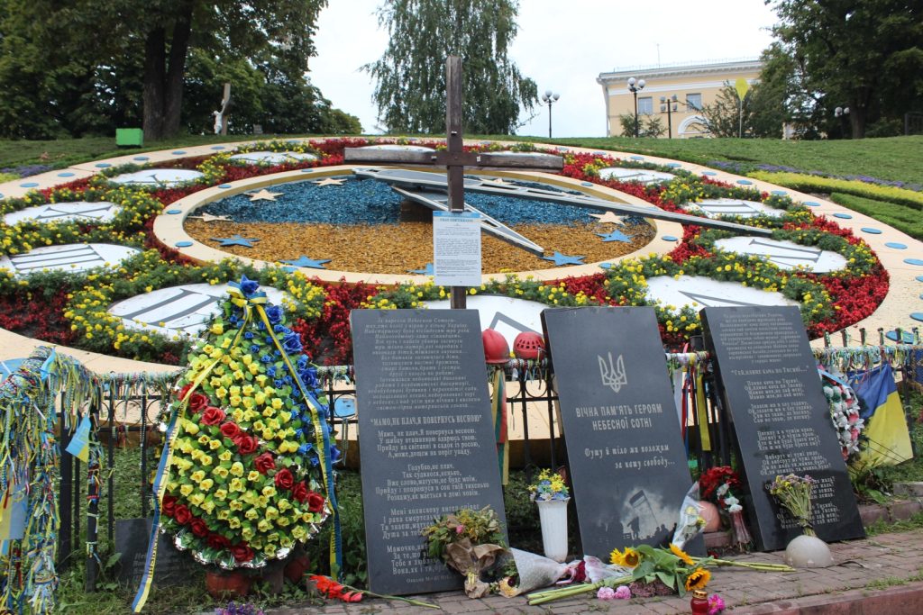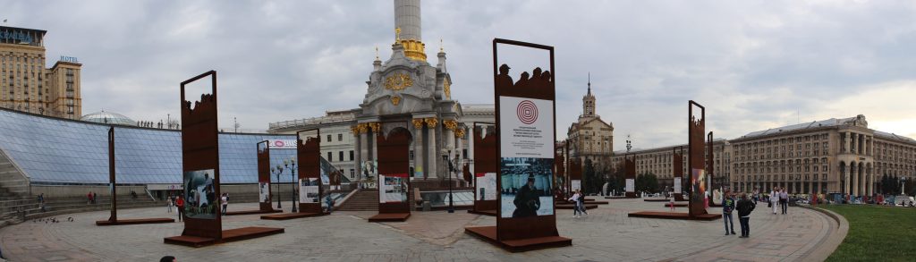 Plac Niepodległości jest przedzielony w poprzek ulicą Kreszczatyk. Idąc w górę po lewej stronie znajduje się wystawa upamiętniająca ofiary Euromajdanu.