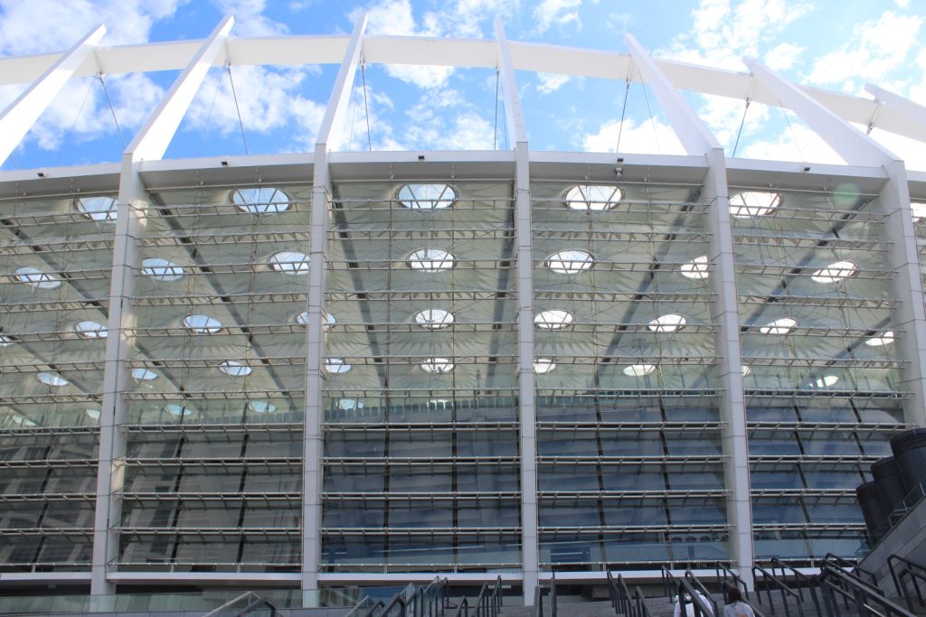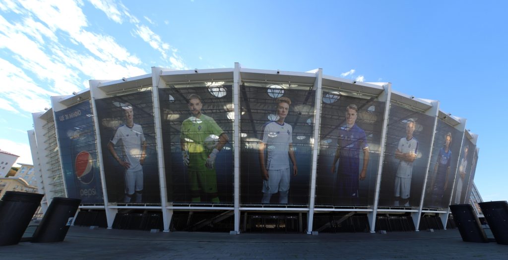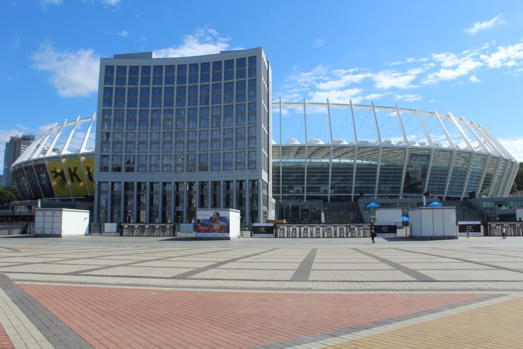 Zajrzyjmy więc jak wygląda arena meczu finałowego. Nie wejdziemy do środka, bo nie za bardzo mamy na to czas. Obejrzymy chociaż z zewnątrz. Przed państwem stadion olimpijski w Kijowie.