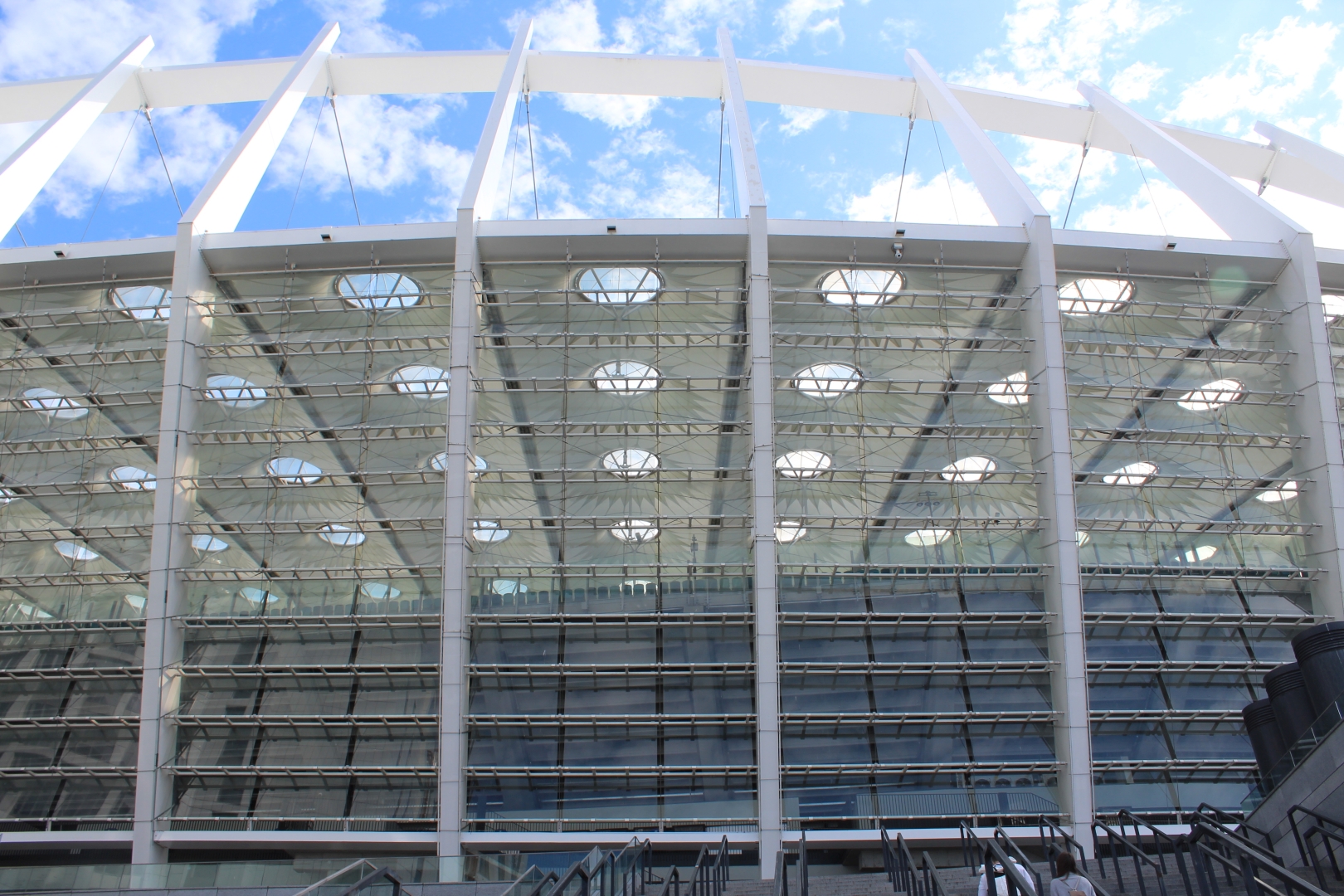 Zajrzyjmy więc jak wygląda arena meczu finałowego. Nie wejdziemy do środka, bo nie za bardzo mamy na to czas. Obejrzymy chociaż z zewnątrz. Przed państwem stadion olimpijski w Kijowie.