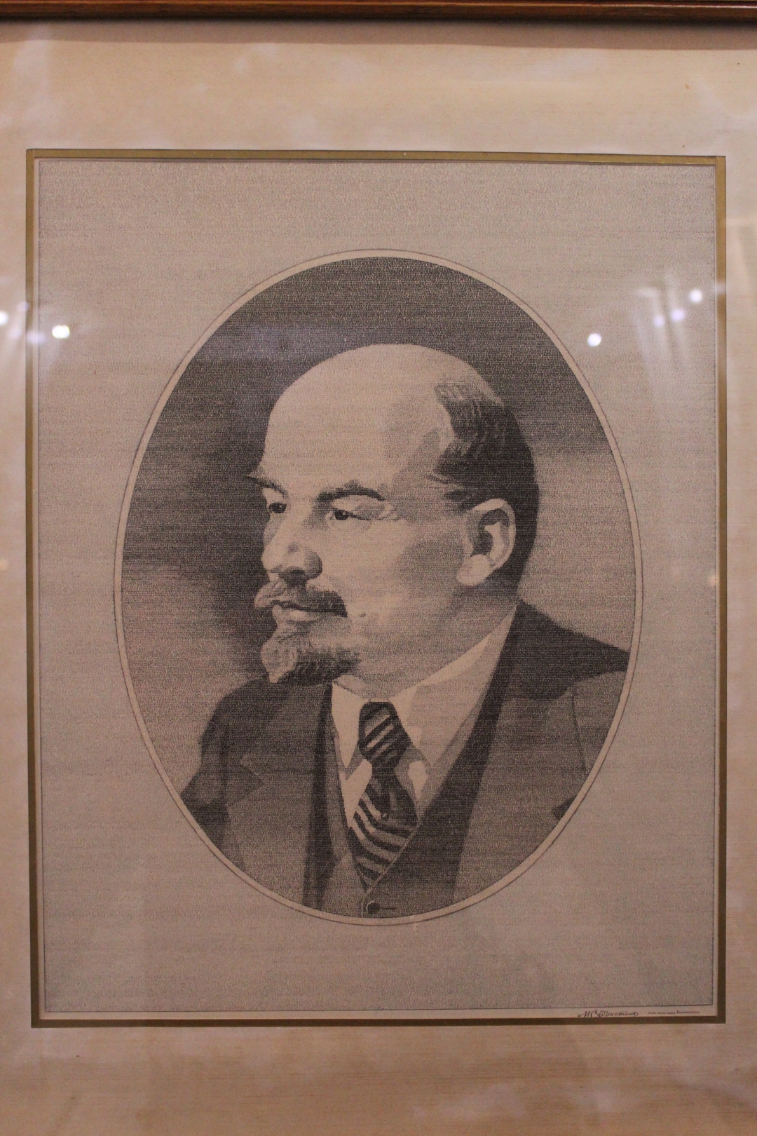 Wchodzimy do muzeum mikrominiatur. Jest tam wiele niezwykle ciekawych dzieł niezwykle trudnych do sfotografowania (np. grawery wykonane na ludzkim włosie przeciętym wzdłuż(!)). Zachęcam do odwiedzenia osobiście. Ja wybrałem jeden smaczek – portret Lenina wykonany za pomocą zręcznego operowania czcionką. Tekstem użytym do powstania portretu jest fragment dzieła samego portretowanego.